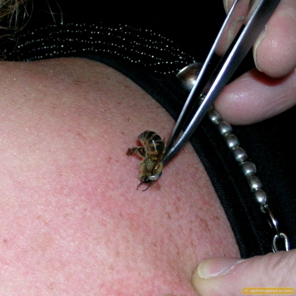 La apiterapia es una técnica manual, de medicina alternativa y complementaria que consiste en el uso de los productos de la colmena, incluída la terapia con veneno de abeja (apitoxina). Es una terapia que cura sin dañar, de manera natural aprovechando todos los productos de la abeja, como son la Miel, el Polen, el Propóleo, la Jalea Real, las Larvas de Zángano y la Apitoxina. La picadura con veneno de abeja permite al organismo utilizar sus propias defensas y combatir las enfermedades. Entre las características principales de la Apiterapia con veneno de abeja, está la de que la apitoxina (veneno de abeja) es ochenta veces más potente que la morfina y opiáceos, por tanto es un gran analgésico local, tiene una importante acción bacteriostática, es decir paraliza el crecimiento de bacterias, también tiene acción bactericida, mejora el funcionamiento del hígado, así como la actividad cerebral, y es un antidepresivo potente. El veneno de abeja trata con mucha eficacia enfermedades reumáticas, artrosis, artritis y osteoporosis, ayuda en la eliminación de toxinas, es un potente antiinflamatorio y se ha comprobado que es 500.000 veces más fuerte que cualquier otro antibiótico, elimina dolores musculares, disminuye la presión arterial y estimula el sistema inmunológico, además de ser muy efectiva contra la psoriasis. - Para practicar la apiterapia con veneno de abeja, se transporta un pequeño grupo de abejas en una caja. Esta terapia está contraindicada en casos como Alergia al Veneno de Abeja, Diabetes, Enfermedades infecciosas, Tuberculosis, Cardiopatías, Embarazo, entre otros. Por tanto, para realizar un buen tratamiento de Apiterapia, no sólo realizamos la apipuntura (acupuntura con abejas), sino también la combinación de todos los productos de la colmena. |